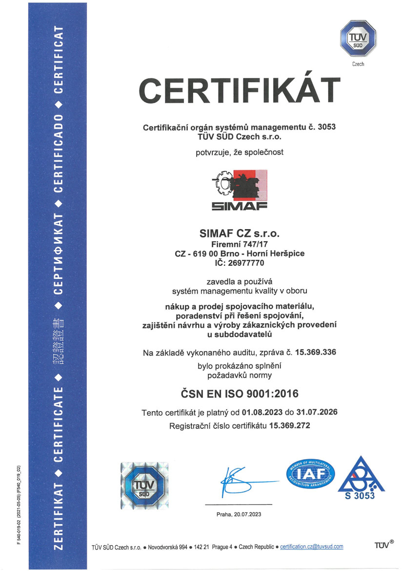 Společnost SIMAF s.r.o. je hrdým držitelem certifikátu ISO 9001, mezinárodně uznávaného standardu pro systémy řízení kvality. Tento certifikát je pro vás zárukou, že všechny naše interní procesy – od přijetí poptávky, přes technické poradenství, až po skladování a expedici zboží – jsou přesně definovány, kontrolovány a neustále zlepšovány s jediným cílem: zajistit vaši maximální spokojenost.