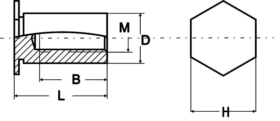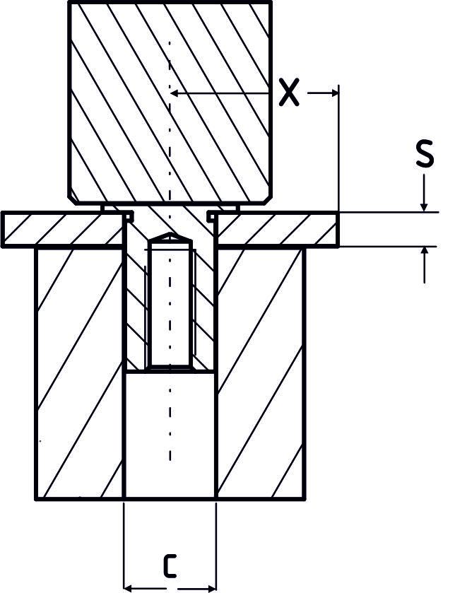 | Produkt | Závit M | S min. | Ø díry +0,08 | ØD -0,13 | H | L | B | X | Ø C + 0,08 |