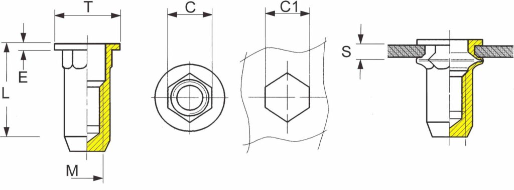 Nýtovací matice s redukovanou hlavou, částečný šestihran, uzavřená, šestihranný dřík