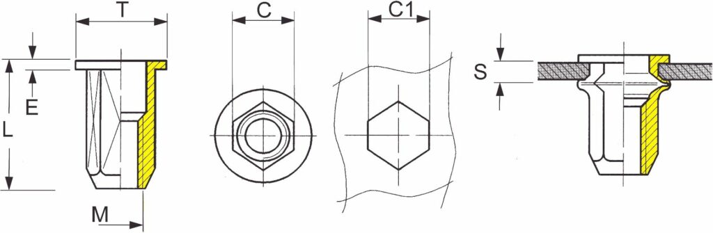 Nýtovací matice s plochou hlavou, průchozí, šestihranný dřík, tvářená